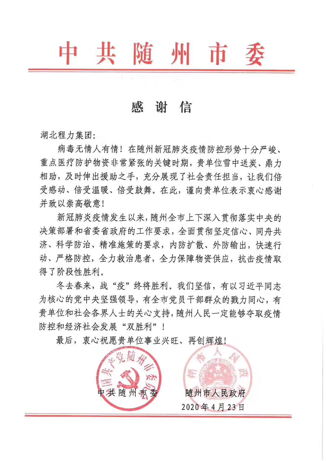 4月27日,程力公司繼國務(wù)院感謝信點(diǎn)贊鼓勵后,又收到了來自隨州市委、市政府署名的感謝信,表揚(yáng)程力公司在防控疫情期間的社會責(zé)任擔(dān)當(dāng),這是全體程力家人們共同的榮譽(yù),我們堅信在黨中央國務(wù)院,省委省政府,市委市政府的領(lǐng)導(dǎo)下,一定能夠奪取疫情防控和經(jīng)濟(jì)社會發(fā)展"雙勝利"。