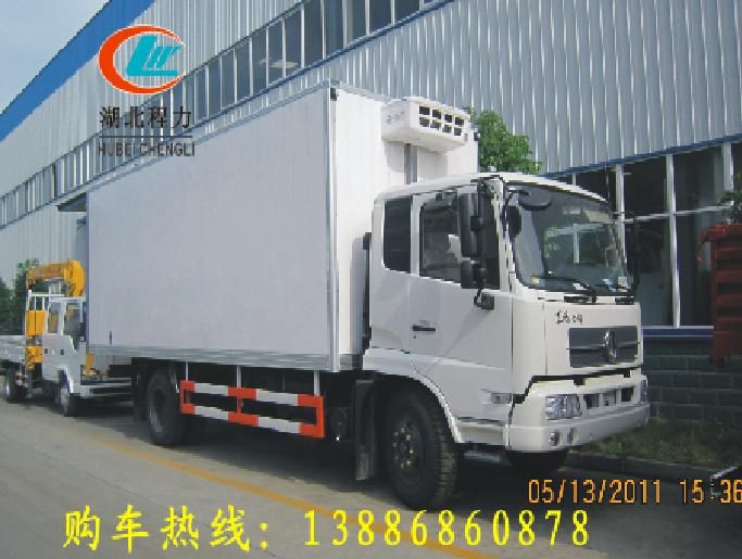 東風(fēng)天錦冷藏車:平頂排半駕駛室可翻轉(zhuǎn),動(dòng)轉(zhuǎn),排氣制動(dòng),900-16輪胎,康明斯170馬力發(fā)動(dòng)機(jī),6檔變速箱DF6S900,9噸后橋,廂長(zhǎng)6000*2250*2300
