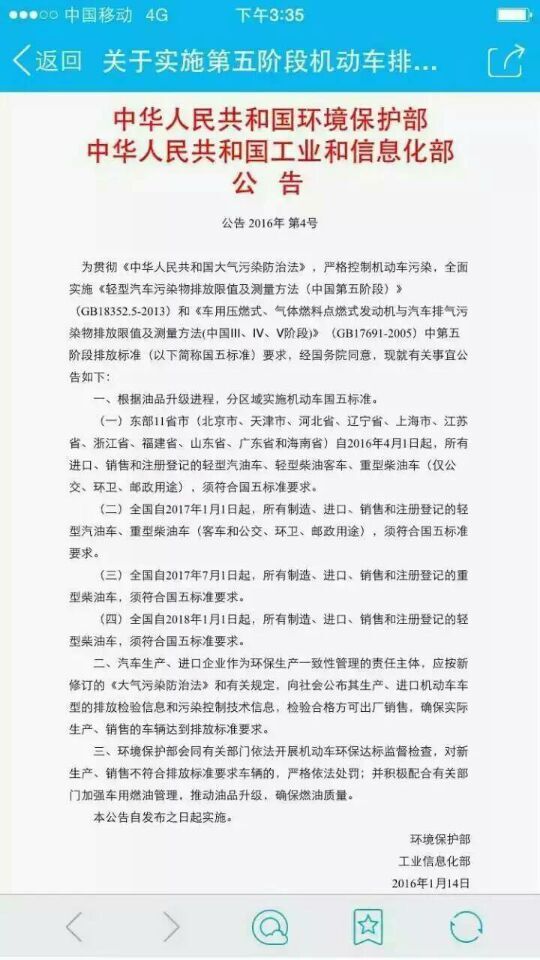 。ㄒ唬〇|部11省市(北京市、天津市、河北省、遼寧省、上海市、江蘇省、浙江省、福建省、山東省、廣東省和海南省)自2016年4月1日起,所有進(jìn)口、銷售和注冊登記的輕型汽油車、輕型柴油客車、重型柴油車(僅公交、環(huán)衛(wèi)、郵政用途),須符合國五標(biāo)準(zhǔn)要求。
