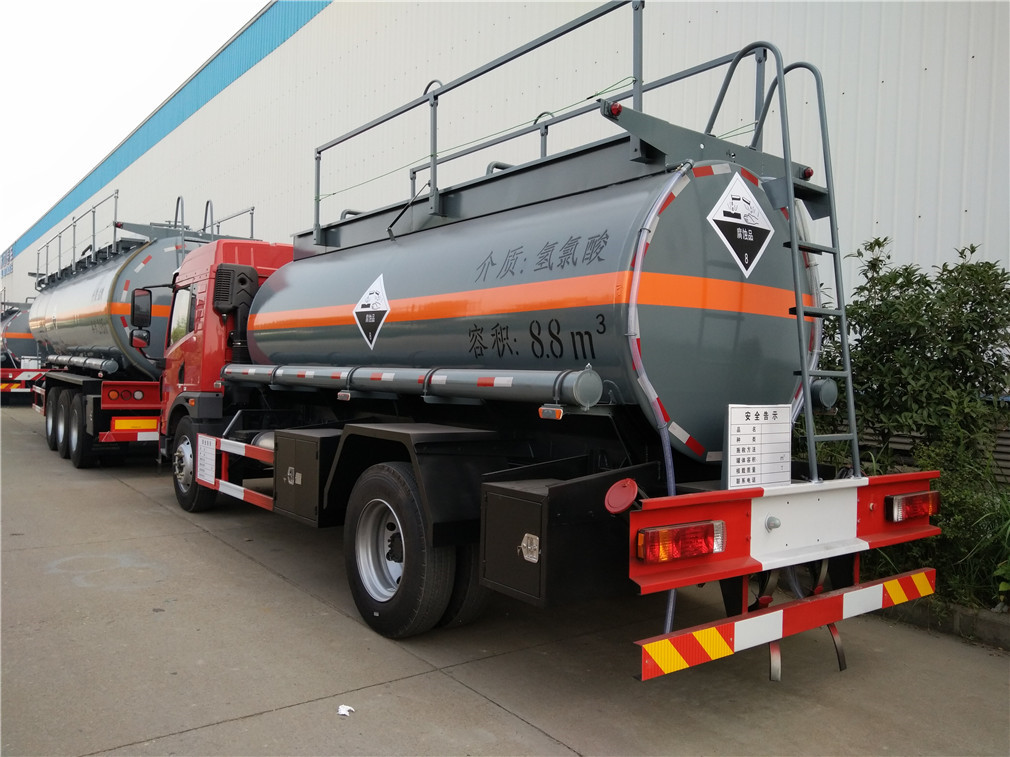 | 其他 | 该车适用于危险品运输。运输介质品名:次氯酸钠,液碱,氢氯酸,硫酸,氨水,密度分别为:1050千克/立方米,1040千克/立方米,1047千克/立方米,1045千克/立方米,990千克/立方米;类项号:8;罐体有效容积:8.8立方米,罐体外形尺寸(长×直径)(mm):5200×1600。随底盘选装平顶驾驶室。防护材料:Q235A碳钢,连接方式:左右侧面及后部防护均采用焊接连接,后部防护断面尺(mm):140×50, 后部防护离地高度(mm):450。仅采用底盘子午线轮胎型号(9.00R20 16PR,10. | ||