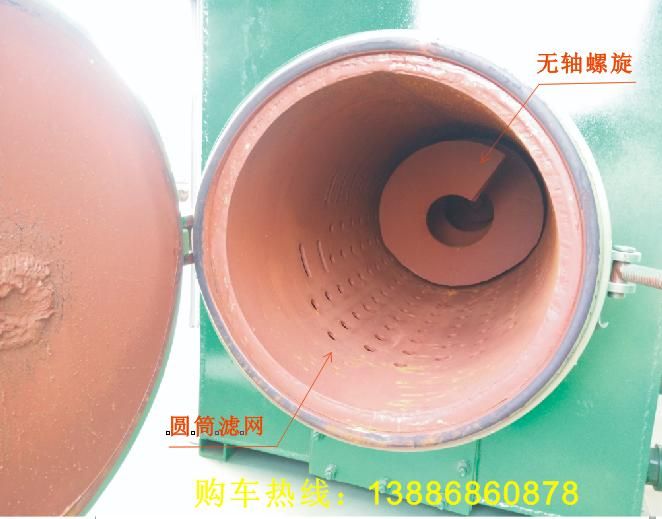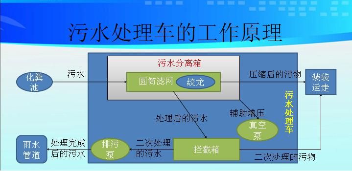 •作業(yè)時將化糞池的污物吸到污水箱中,污水箱中安裝有無軸螺旋、圓筒濾網(wǎng),可將固態(tài)污物過濾出來并壓縮,液態(tài)污水經(jīng)過攔截箱后被排污泵排出。
