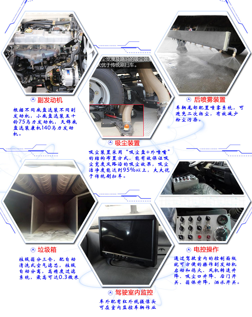 | 其他 | 吸塵車:該車用途為路面吸塵,主要裝置為箱體、吸盤、取力器組成。選裝帶掃刷裝置;選裝后方向指示箭頭,側防護由專用裝置替代,后防護采用碳鋼/Q235B,螺栓連接,截面高100mm,截面寬50mm,下邊緣離地高420mm。ABS及其控制器型號為:APG3550500A4,生產(chǎn)廠家為:浙江亞太機電股份有限公司。 | ||